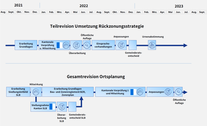 Oben zur Teilrevision Umsetzung Rückzonungsstrategie, unten zur Gesamtrevision der Ortsplanung. Während bei der Gesamtrevision die Arbeiten zum Siedlungsleitbild abgeschlossen werden und mit der Erarbeitung der Nutzungsplanung begonnen wird, laufen parallel die Schritte zur Teilrevision Umsetzung Rückzonungsstrategie. Geplant ist eine entsprechende Urnenabstimmung im März 2023.